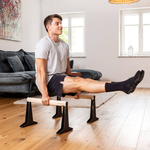 Le maniglie ergonomiche in legno delle Parallettes garantiscono il massimo comfort e una posizione naturale della mano.