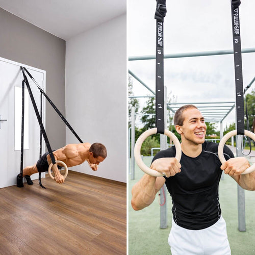 D'ora in poi il vostro allenamento non avrà più limiti! Utilizzate i robusti anelli di legno ovunque, al parco, a casa o in viaggio. Basta agganciarli e iniziare!