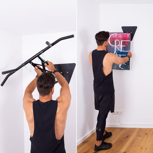 L'esclusivo design angolato consente di passare dalle trazioni alle dip in pochi secondi . La barra può essere rimossa dalla parete e riposta dopo l'allenamento. L'adattatore a parete può essere coperto da un quadro, ad esempio, quando non viene utilizzato.