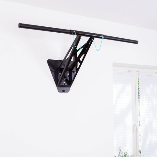 L'esclusivo design angolato consente di passare dalle trazioni alle dip in pochi secondi . La barra può essere rimossa dalla parete e riposta dopo l'allenamento. L'adattatore a parete può essere coperto da un quadro, ad esempio, quando non viene utilizzato.