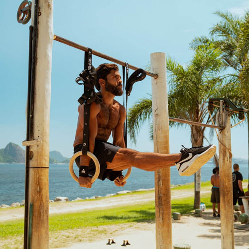 Gli anelli ginnici possono essere utilizzati in aggiunta alle nostre sbarre per trazioni, così puoi svolgere molti più esercizi e completare i tuoi allenamenti di Freeletics o Calisthenics.