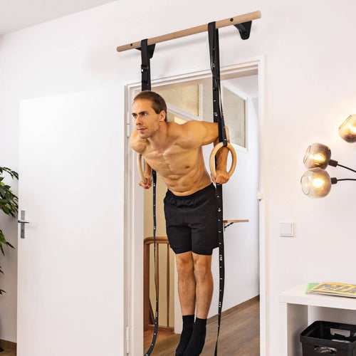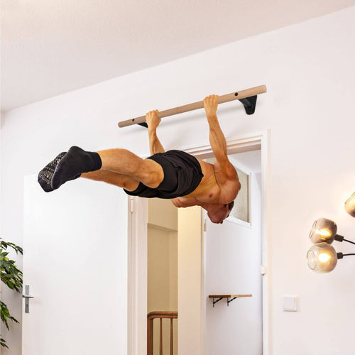 La barra di trazione in legno si monta sopra il telaio della porta, nei corridoi o su travi stabili per risparmiare spazio. Permette di eseguire un'ampia varietà di esercizi: trazioni classiche, chin-up, sollevamenti delle gambe e movimenti impegnativi come le leve frontali o le prese a L. In combinazione con gli anelli ginnici o le imbragature, è possibile rendere l'allenamento ancora più vario.